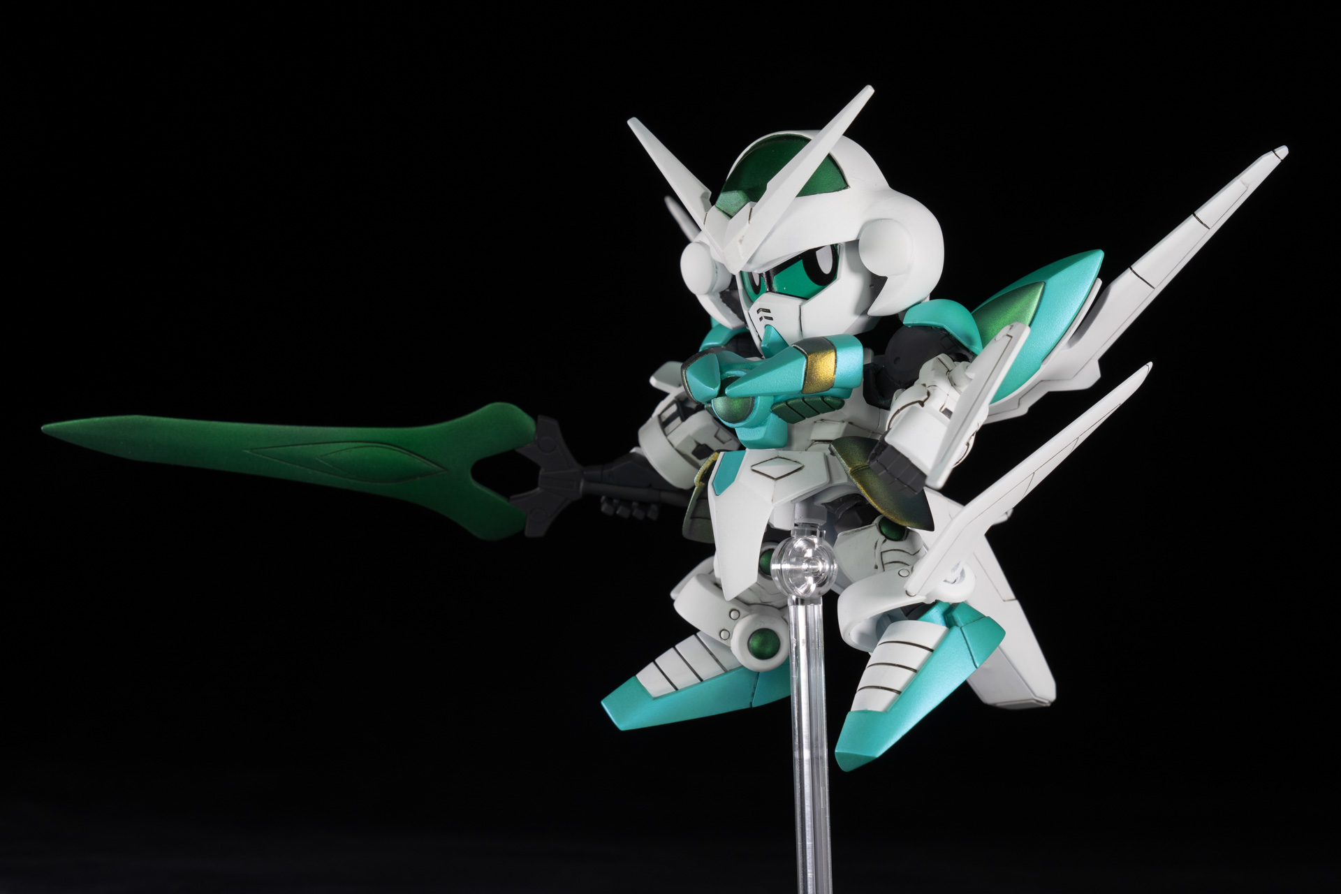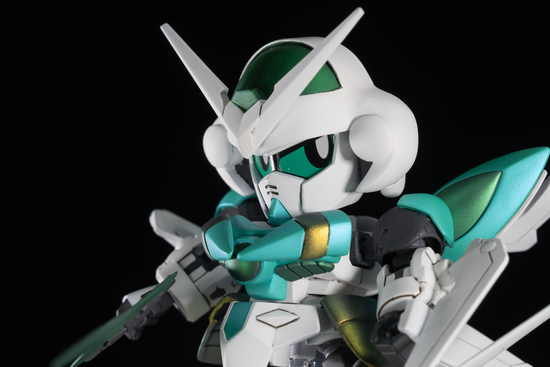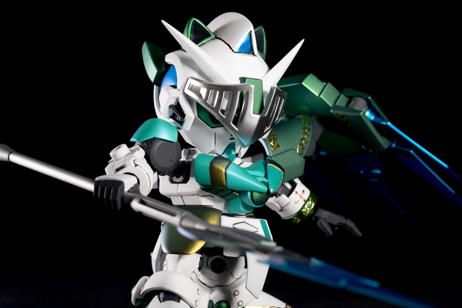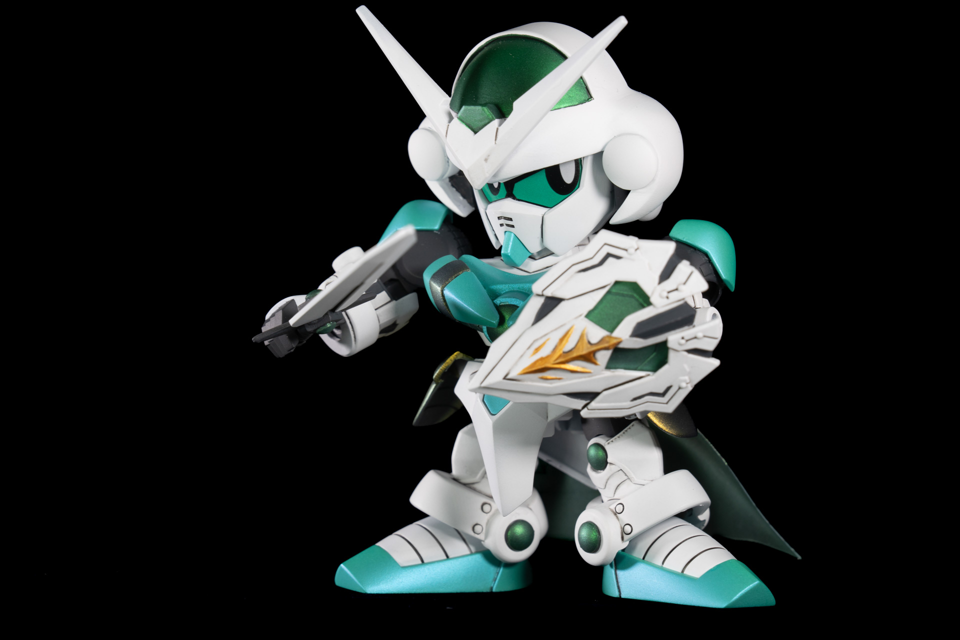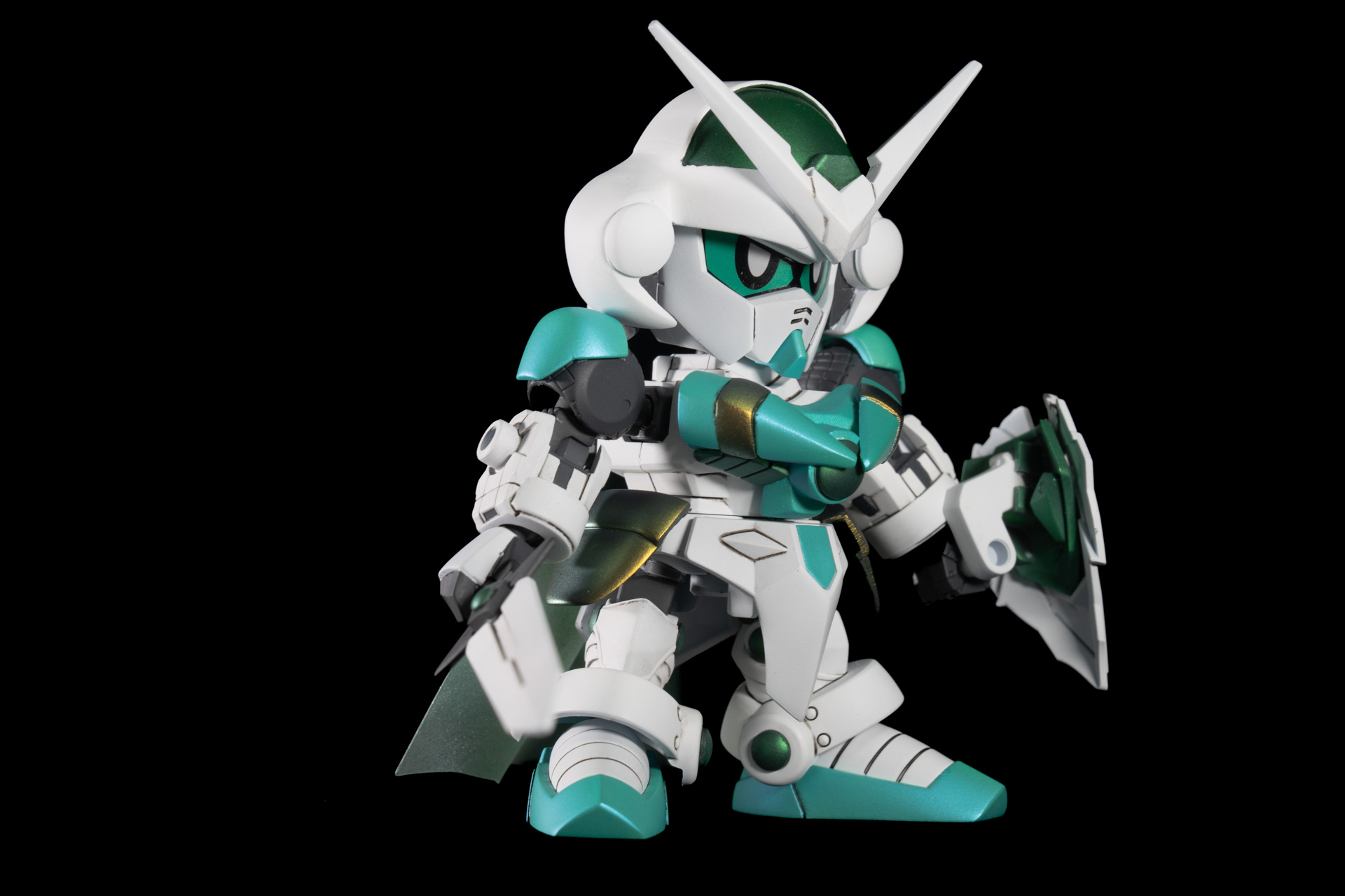 バンダイから発売のレジェンドBBシリーズを組み合わせ、一部パテ等によるスクラッチにより作成したオリジナルのSDガンダムとなります。 剣士→騎士→聖騎士とランクアップしながら、G-ポータント→シアクアンタとモチーフのMSがグレードアップする様に制作しました。