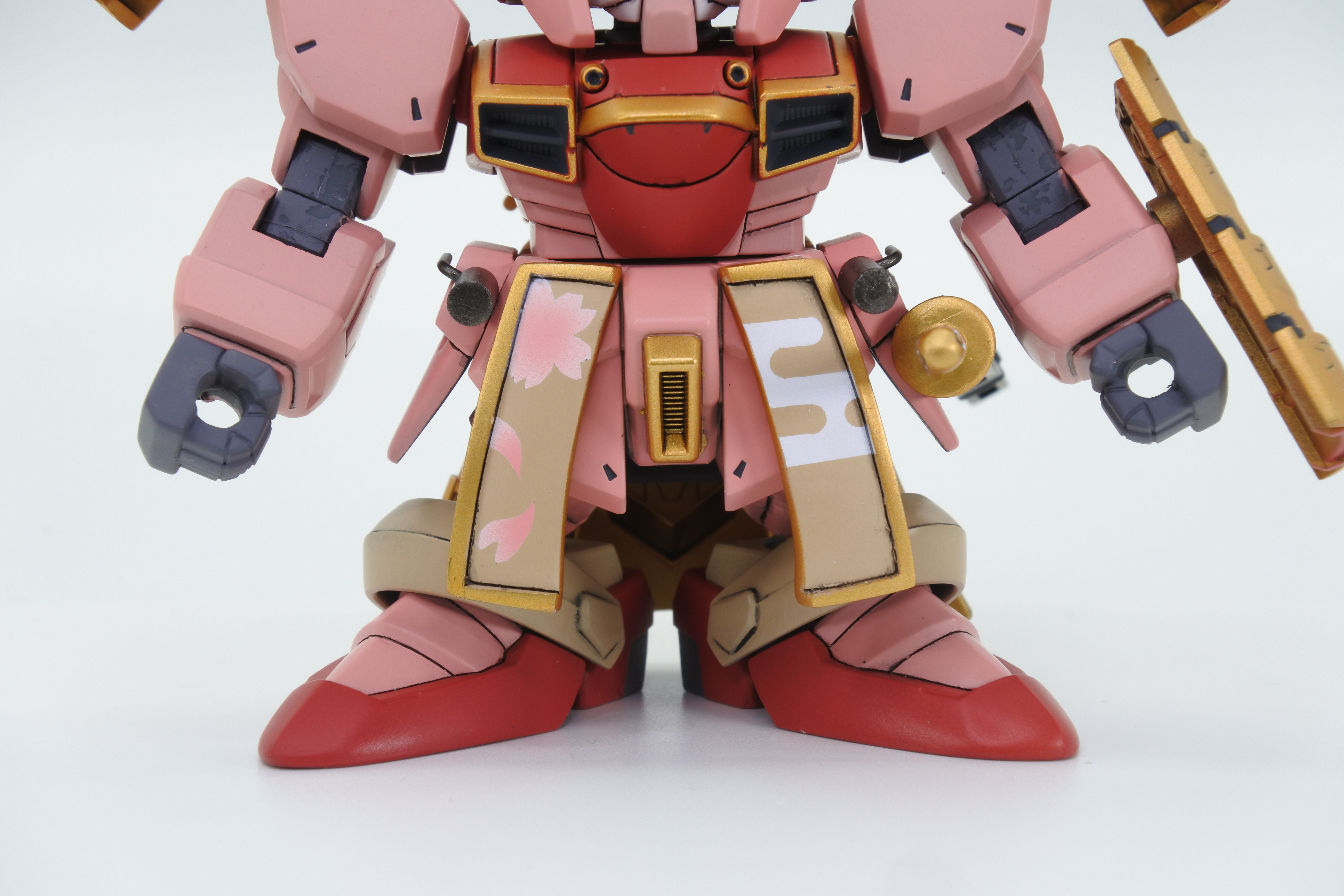 武器は刀と2本の十手になります。 今回のイチオシポイントは、腰の前部分の和柄です。向かって左には桜の花びらを、右側には和柄でよく見る棒状(?)の雲です。 全体として、和を意識した色味や配色を心がけて塗装しました。 塗装の大まかな流れは、ラッカー→アクリル→ふき取り→エナメル→ふき取りの順番で塗装しました。