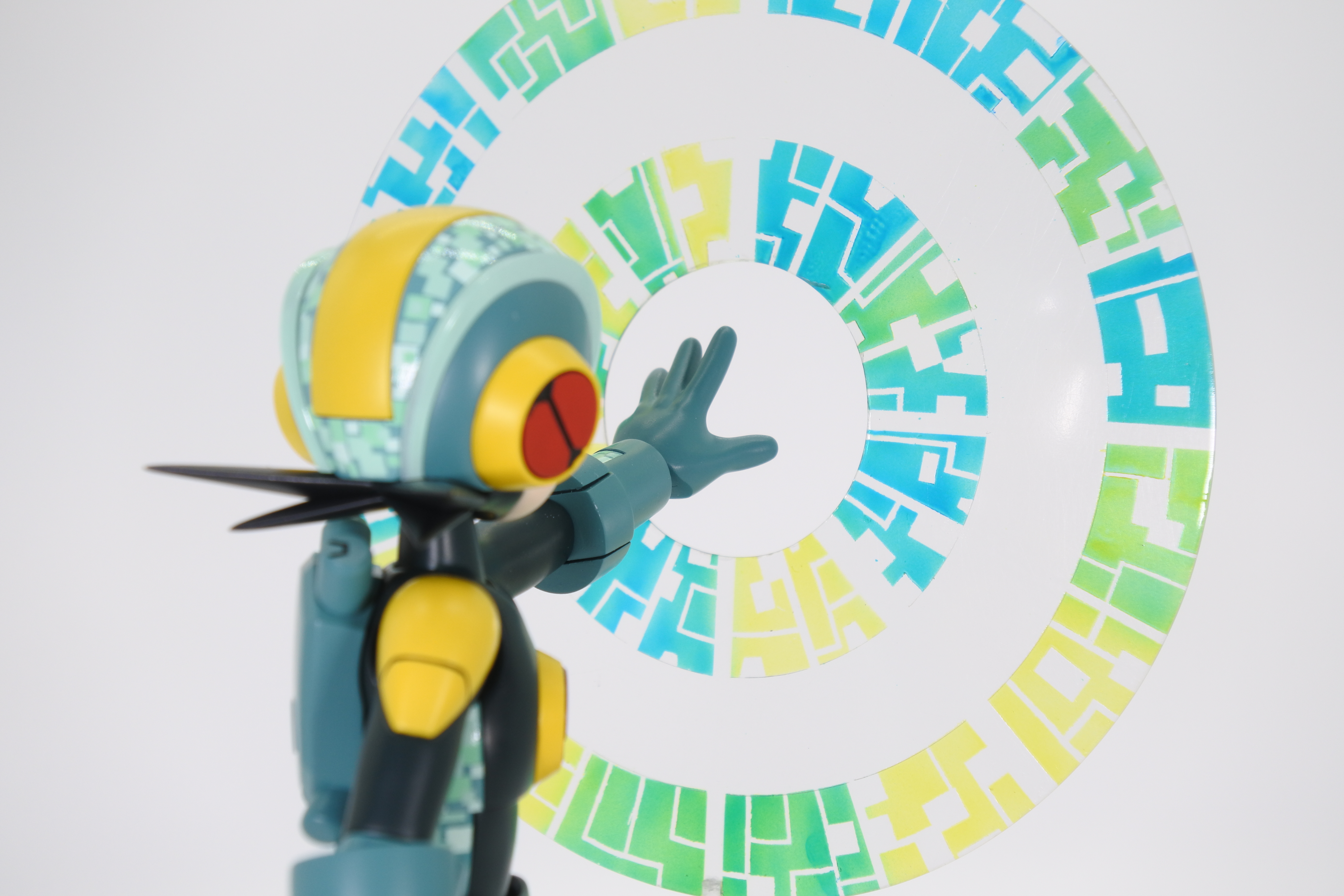 エフェクトパーツは、透明プラ板を丸く切り出し、マスキングで模様の再現をしました。